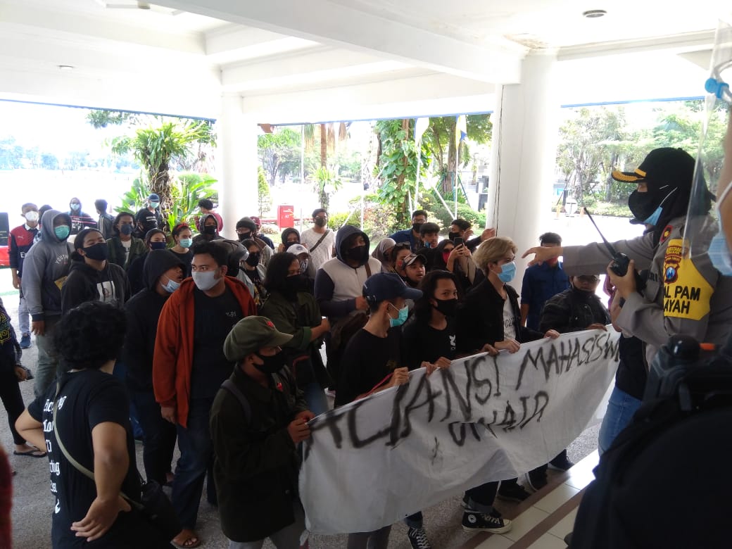Massa aksi berhasil mencapai teras Gedung Rektorat Unair setelah sebelumnya tidak diperbolehkan masuk oleh tim keamanan kampus (Mercusuar/Primanda)