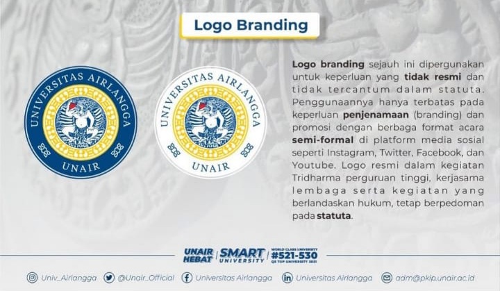 Pada laman identitas dalam website unair.ac.id, hanya tercantum statuta logo resmi, tidak ada keterangan penggunaan atau guideline mengenai logo branding, hanya paparan secara singkat di Instagram. Logo branding ini disediakan pada laman download.