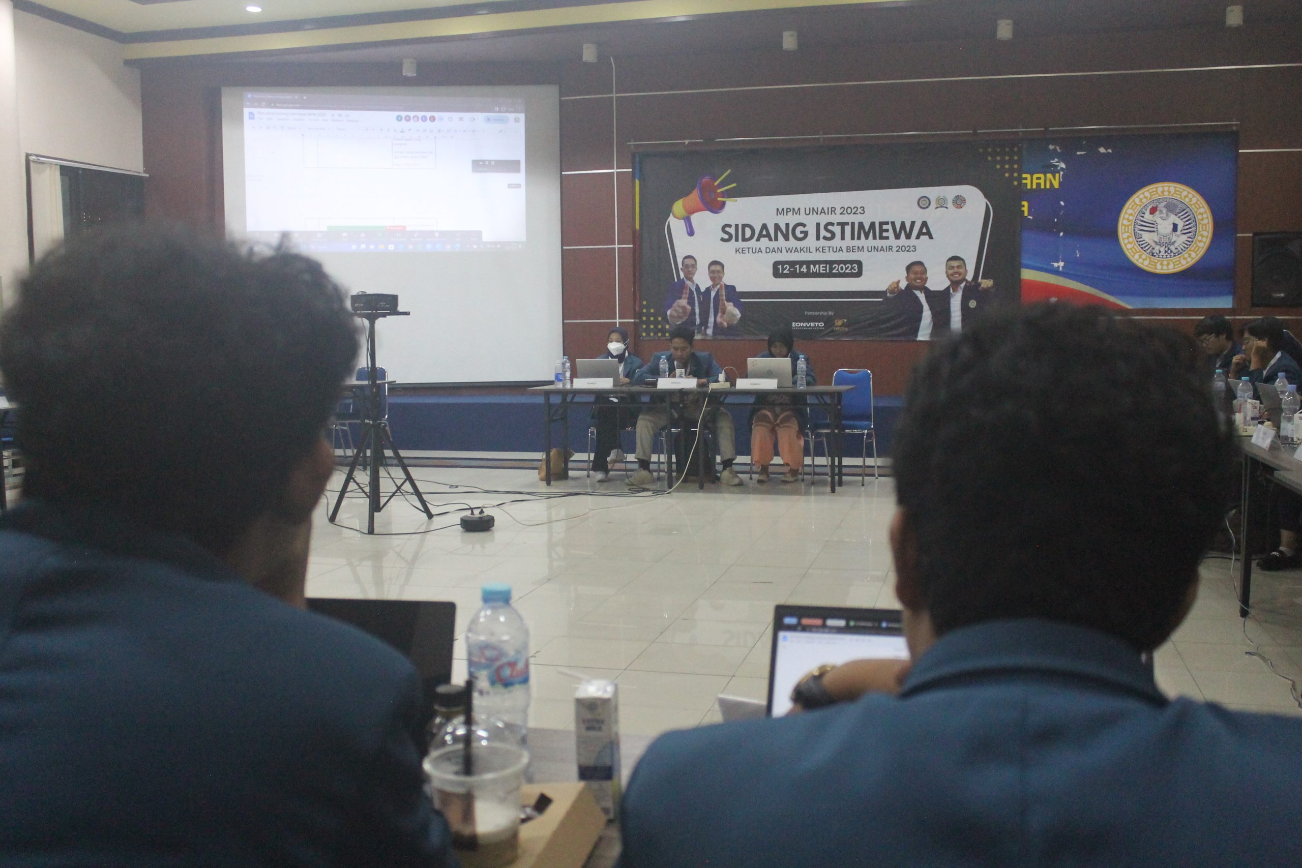 Sidang istimewa Pemilihan Ketua dan Wakil Ketua BEM UNAIR kembali dilangsungkan. Pada kesempatan ini, pemilihan ketua dan wakil ketua BEM dilimpahkan kepada MPM 2023. Sidang ini diagendakan terlaksana pada 12-14 Mei 2023.