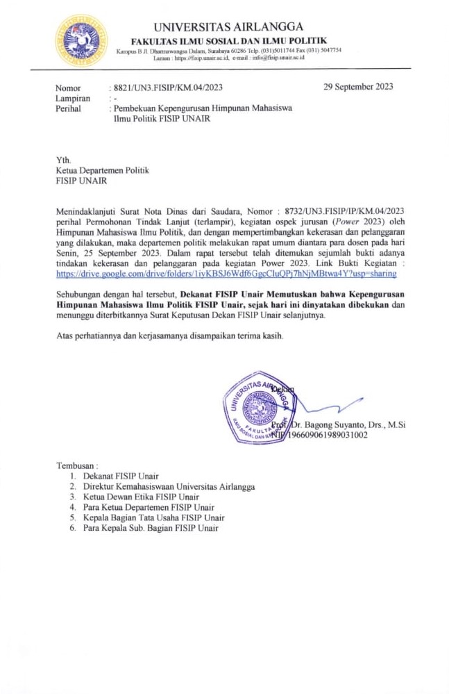 Melalui surat ini, pihak Dekanat FISIP menyebutkan bahwa dalam kegiatan ospek Jurusan Ilmu Politik (Power 2023), HIMA Jurusan Ilmu Politik telah terbukti melakukan pelanggaran dan tindak kekerasan. Dari pertimbangan tersebut pihak dekanat secara tegas mengambil tindakan untuk membekukan Himpunan Mahasiswa Ilmu Politik UNAIR. Dalam isi surat tersebut turut dicantumkan bukti berupa link dari google drive. Meskipun demikian, akses untuk membuka satu-satunya bukti yang tersedia tidak bisa dibuka, kemungkinan sudah dihapus. Tanpa akses tersebut bentuk kekerasan dan pelanggaran seperti apa yang telah dilakukan tidak dapat diketahui.