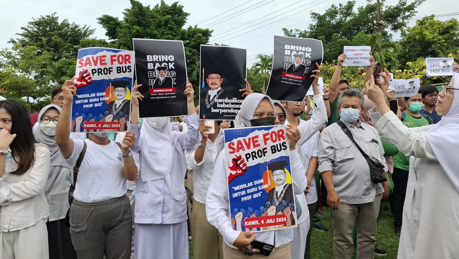 Pada (4/7), Fakultas Kedokteran menggelar Aksi Damai Ksatria Airlangga di depan patung Airlangga Fakultas Kedokteran UNAIR sebagai bentuk pernyataan sikap atas keputusan pemberhentian jabatan dekan Fakultas Kedokteran UNAIR, Prof. Dr. Budi Santoso, dr., Sp.O.G., Subsp.F.E.R., secara sepihak oleh rektor Universitas Airlangga. Dengan tagline “Save Prof. BUS Dekan Kita, Save Dokter Indonesia”, aksi ini menjadi teguran keras kepada pimpinan UNAIR yang mengeluarkan putusan tanpa alasan dalam pemberhentian dekan Fakultas Kedokteran sehingga menciderai ruang berekspresi intelektual.