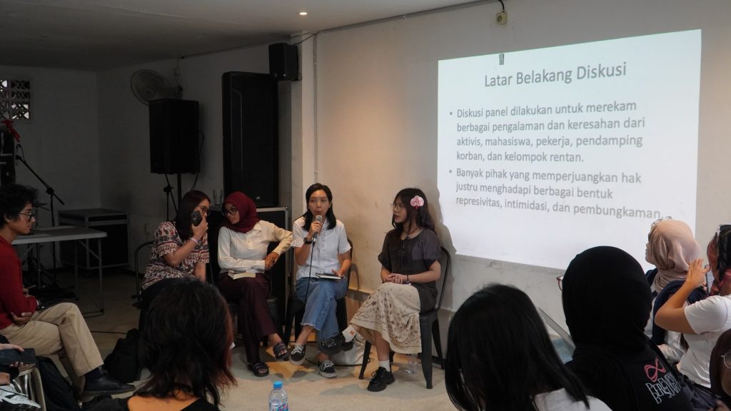 Kegiatan diawali dengan pemutaran film “Ini Scene Kami Juga”, yang mengangkat cerita tentang keterlibatan perempuan dalam skena DIY (Do It Yourself) punk di Indonesia. Film ini menghadirkan 14 perempuan sebagai narasumber, mulai dari pemain band, penulis zine, hingga fotografer, yang membagikan pengalaman mereka terlibat dalam komunitas hardcore punk sekaligus menemukan ruang berekspresi di dalamnya. Namun, genre hardcore punk kerap dilabeli sebagai “dunia laki-laki”, sehingga perempuan masih sering diposisikan sebagai minoritas dalam skena tersebut. Bahkan, salah satu narasumber dalam film itu menceritakan pengalamannya mengalami pelecehan seksual saat moshing yang meninggalkan trauma dan menunjukkan betapa minimnya ruang aman serta kebebasan berekspresi bagi perempuan pada masa itu.