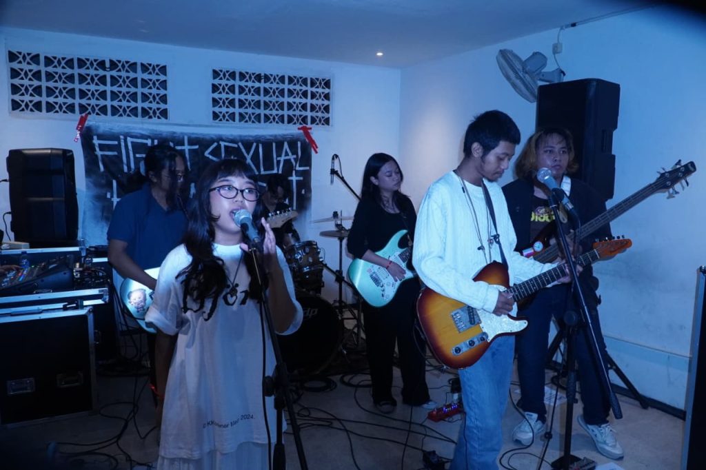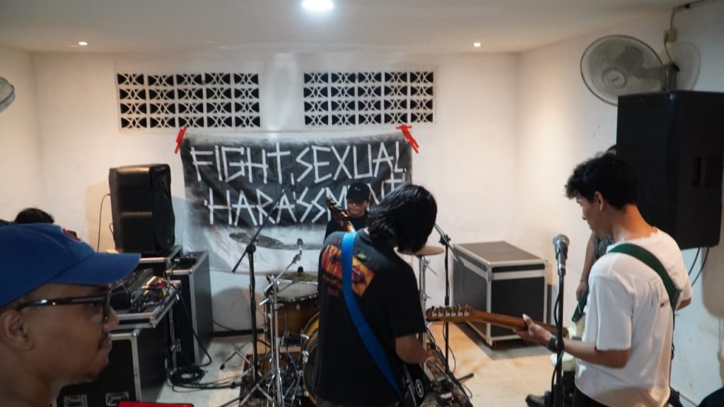 Sederet band dari berbagai genre tampil meramaikan rangkaian acara menuju puncak International Women’s Day (IWD) 2026 Surabaya. Malam itu, Minggu (8/3), Cafe Pantry Surabaya dipenuhi distorsi emo-violence, alternative rock, hardcore, midwest skramz, hingga dream pop yang menggedor telinga sekaligus memacu adrenalin penonton. Melabuh Kelabuh, Lucy, Seeds, Encounter, dan Drizzly bergantian naik panggung—bukan sekadar menghibur, tetapi juga merawat solidaritas sekaligus menyuarakan isu kekerasan berbasis gender yang masih marak terjadi. Di belakang panggung, spanduk DIY bertuliskan “Fight Sexual Harassment” terbentang sebagai pengingat bahwa malam itu bukan hanya tentang musik, tapi juga sikap.