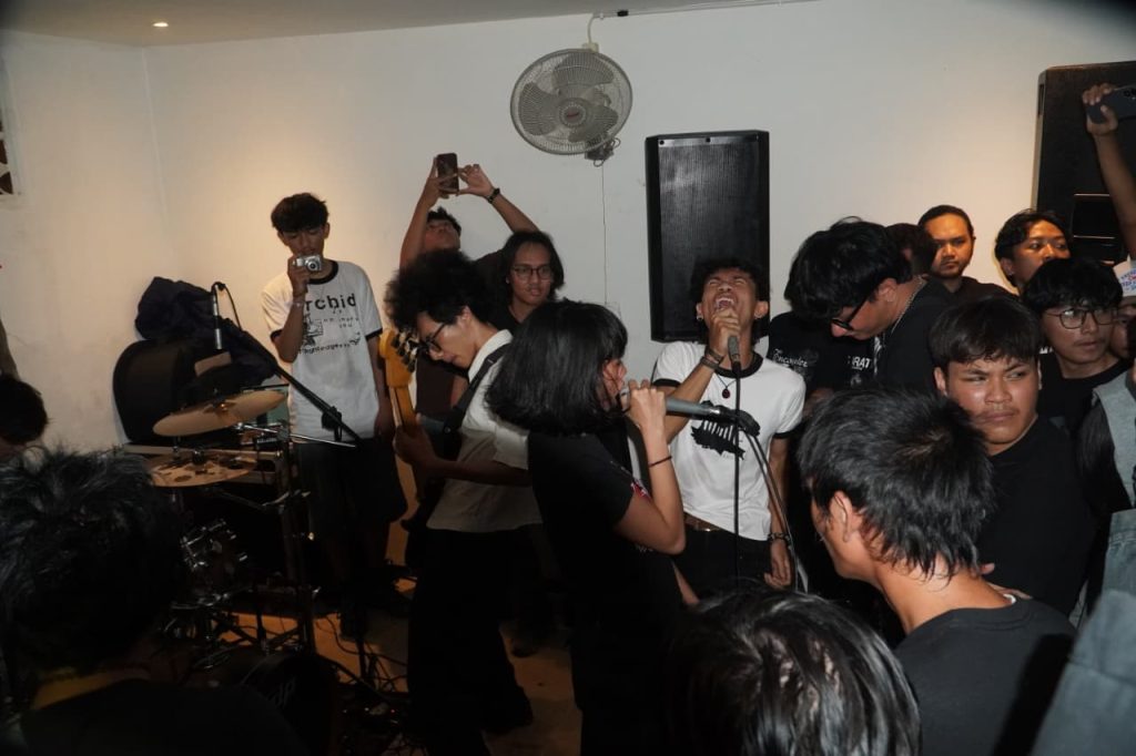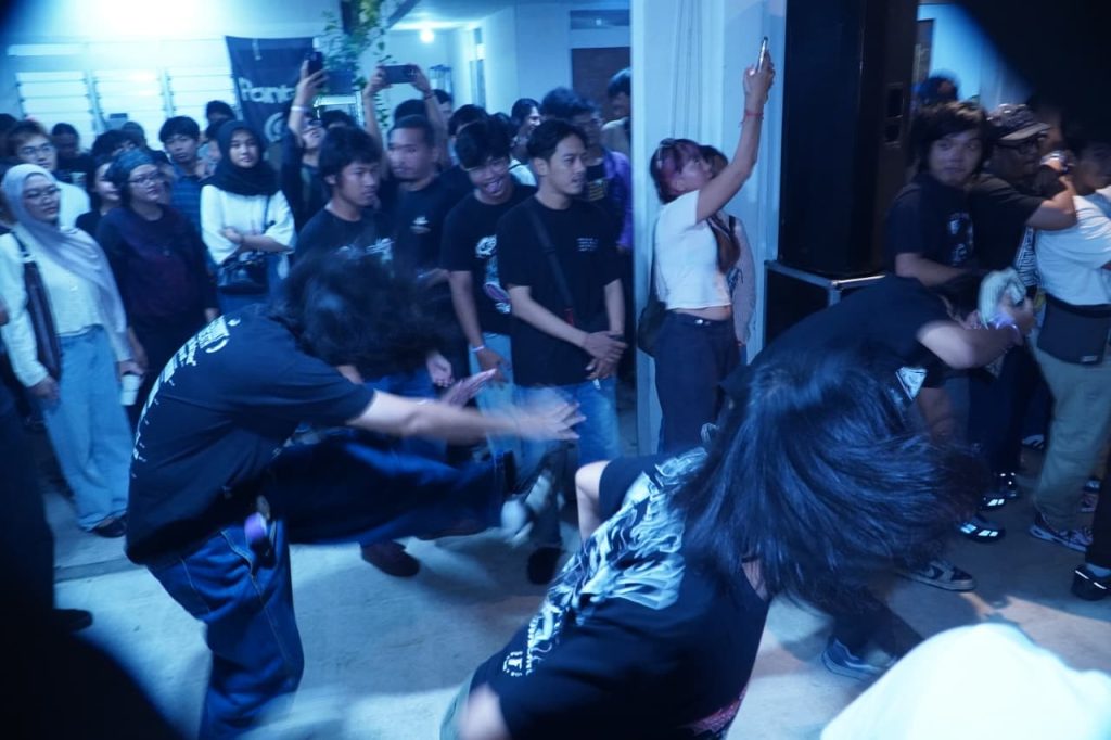 Energi di ruangan belum benar-benar turun ketika Seeds naik sebagai penampil ketiga malam itu. Band hardcore ini langsung menghajar panggung dengan riff cepat dan vokal lantang. Tak butuh waktu lama hingga area depan panggung berubah menjadi lingkaran kecil moshing. Beberapa penonton berlari saling bersinggungan mengikuti tempo musik, sementara yang lain berdiri di pinggir pit sambil mengangguk mengikuti ritme yang padat.